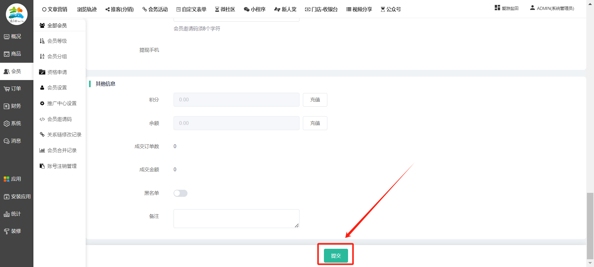 目录 搜索 展开 一、前期准备资料二、数字乡村码-上线操作指南1、服务号的申请流程及认证2、申请小程序流程3、开放平台绑定小程序和公众号三、数字乡村码-系统操作数字乡村码系统管理-概况数字乡村码-商品管理1、发布商品2、商品列表3、商品表单4、商品分类5、品牌管理6、配送模板7、评论管理8、优惠券管理9、商品标签10、退货地址设置11、满额优惠12、批量操作13、配送方式14、基础设置15、商品隐藏四、数字乡村码-会员管理1、全部会员2、会员等级3、会员分组4、资格申请5、会员设置6、推广中心设置7、会员邀请码8、会员关系链修改关系链修改记录9、会员合并记录10、账号注销管理11、会员设置中心五、数字乡村码-订单管理1、订单管理列表2、订单处理流程3、订单状态4、订单修改价格5、订单退款退货6、多包裹发货7、批量发货订单操作步骤8、催发货订单9、物流查询六、数字乡村码-财务管理1、余额设置2、会员余额3、充值记录4、转让记录5、余额明细6、收入明细7、提现设置8、提现统计9、积分管理10、转账审核11、收益广告12、批量充值七、数字乡村码-系统管理1、商城入口2、商城设置①、商城设置②、订单设置③、物流查询④、短信⑤、联系方式⑥、分类⑦、优惠券⑧、分享⑨、幻灯片⑩、广告位⑫、地图设置3、交易设置4、微信模板消息自定义消息模板(新版)自定义消息模板(旧版)小程序消息模板公众号模板消息变更公告5、语言设置6、权限管理7、多媒体管理八、数字乡村码-消息管理九、数字乡村码-应用管理十、数字乡村码系统-数据统计十一、数字乡村码-页面装修DIY1、模板管理2、店铺页面3、顶部导航4、底部导航5、DIY模板市场6、首屏广告7、基础设置8、装修DIY尺寸建议十二、供应商功能插件操作指南1、供应商2、门店-收银台门店申请和使用步骤门店管理①、门店-收银台 营销设置②、门店-收银台 分润设置门店分类门店申请门店审核门店商品门店商品订单收银台订单数据统计核销员基础设置默认设置门店装修3、微社区4、会务活动十三、营销插件操作指南活动报名提货卡新人奖微店问卷调查积分视频分享1、视频分享基础设置2、视频分享发现管理3、视频分享分类管理4、视频分享评论管理5、视频分享分红记录6、视频分享短视频中心每日红包幸运大抽奖签到优惠券二维码任务奖励优惠劵文章音频文章付费文章限时购新海报拓客卡操作流程积分活动素材中心视频红包十四、入驻门店应用类1、门店预约2、附近商品3、门店定位设置4、门店控制5、门店满额包邮6、门店满额减7、导入商品8、门店搜索9、门店股东10、核销券11、多门店核销1、商城后台设置2、前端功能演示十五、常见问题1、后台登录密码修改流程2、会员-余额,积分,后台如何进行充值与扣除3、如何修改上下级关系4、一种万能的获取商城小程序路径的方法 暂无相关搜索结果! 阅读次数:1487 本文档使用 模王系统 发布 8、会员关系链修改 8、会员关系链修改一.如何修改上下级关系?1.会员-全部会员-可以通过搜索用户的独立ID,或者用户微信昵称,找到此会员,然后点击右边的(操作)2.再点击会员详情。3.滑到下面,有个推广信息-会员上线,点击修改4.输入上级的ID号,点击搜索,出来此上级会员后点击选择。5.滑到最下面,一定要点击提交按钮。文档更新时间: 2023-11-30 14:56 作者:链上旅行