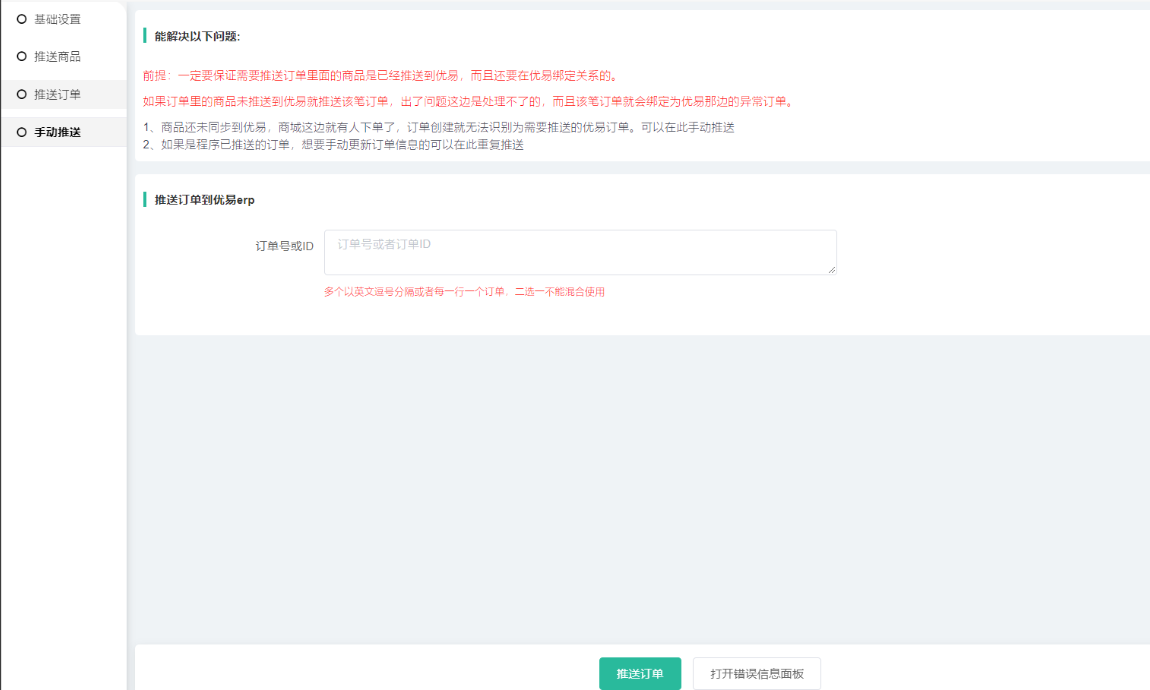 1)复制订单到订单列表搜索--进入订单对应的商品这个查看商品id,核实商品是否已经有推送了,如果是未推送该商品到优易平台那边,手动推送订单是无法推送成功的。